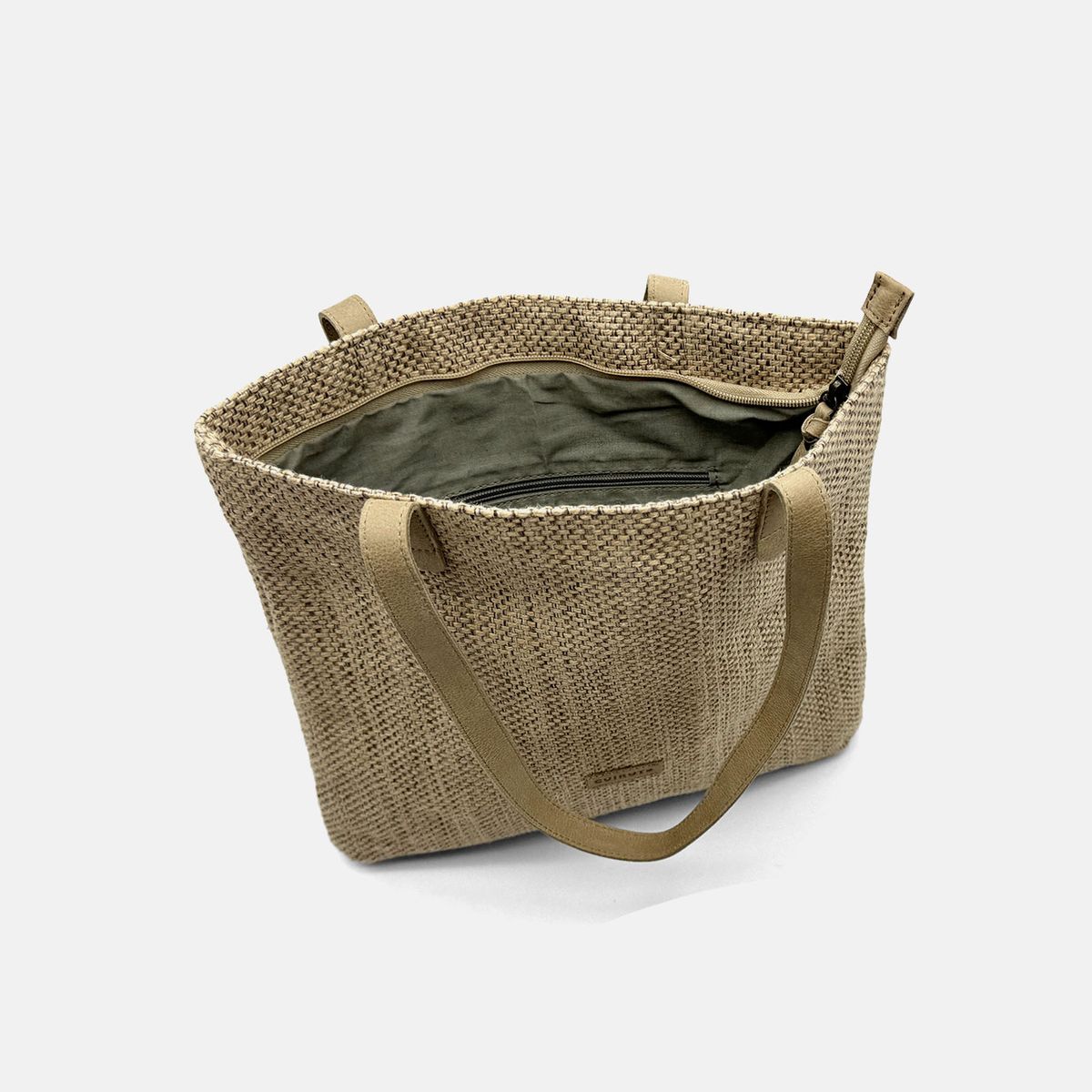 Exterior: Tecido de juta e alças de couro.