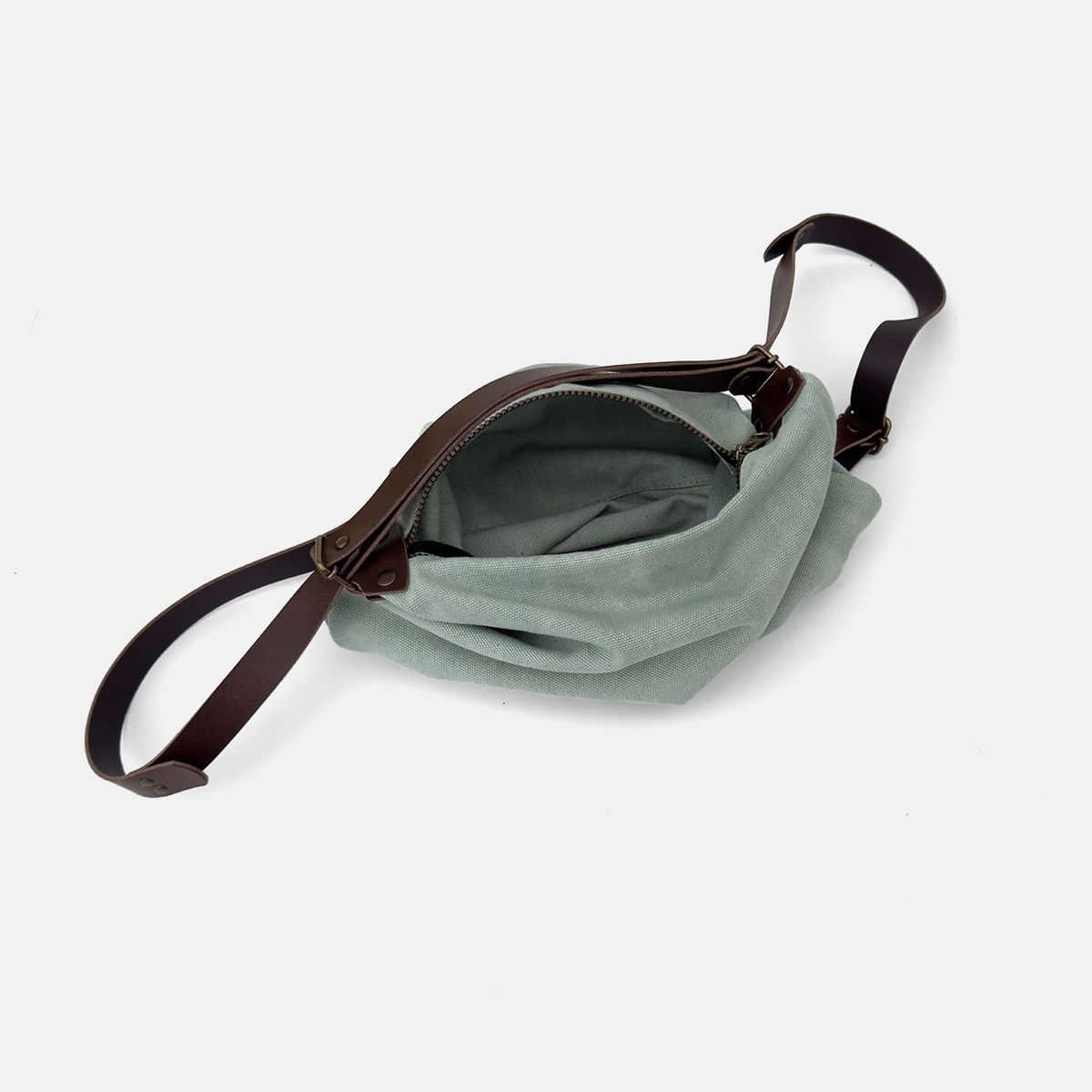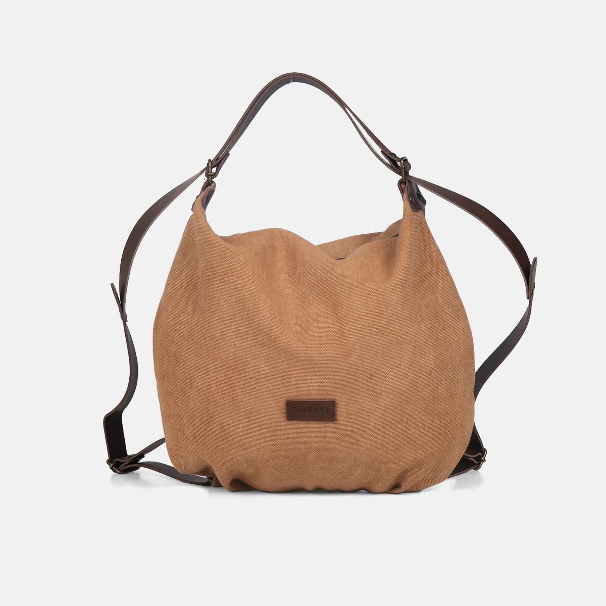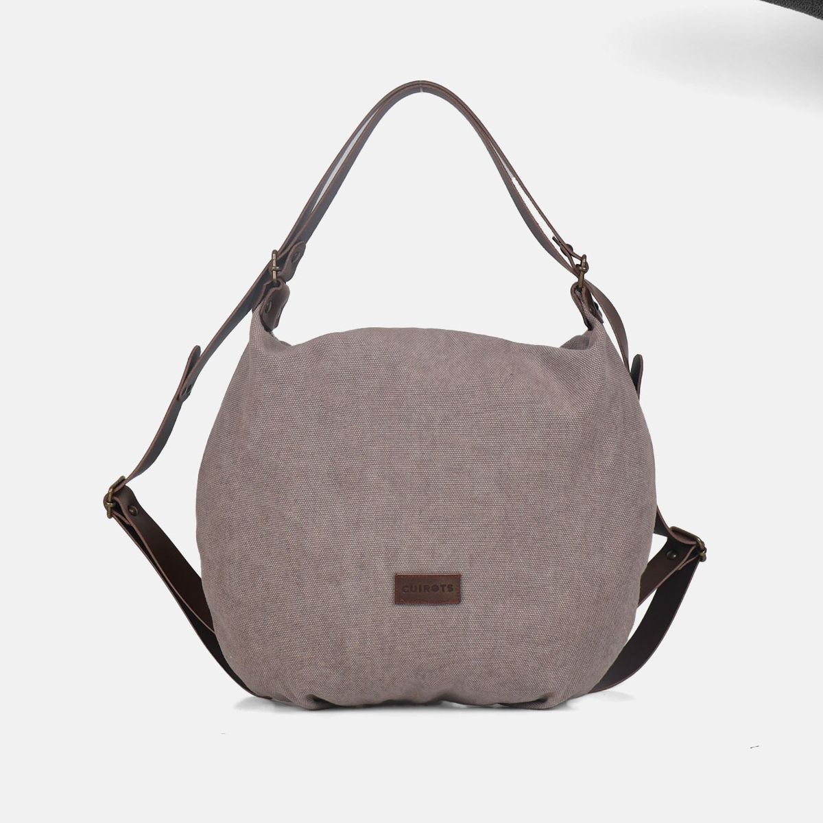 Bolsa de ombro de tamanho médio que se transforma em mochila, oferecendo amplo espaço de armazenamento. Confeccionada com algodão grosso com efeito lavado e alças de couro.