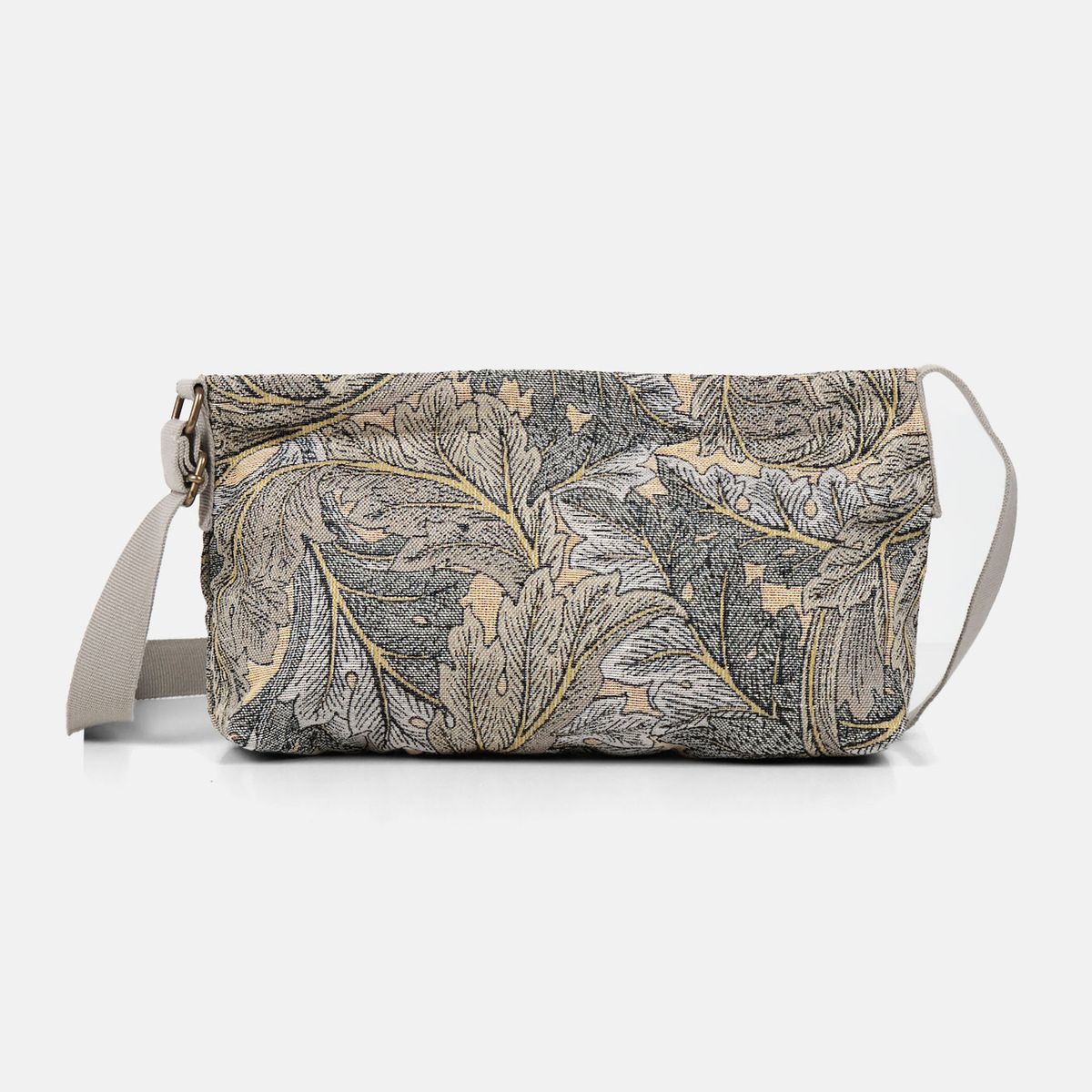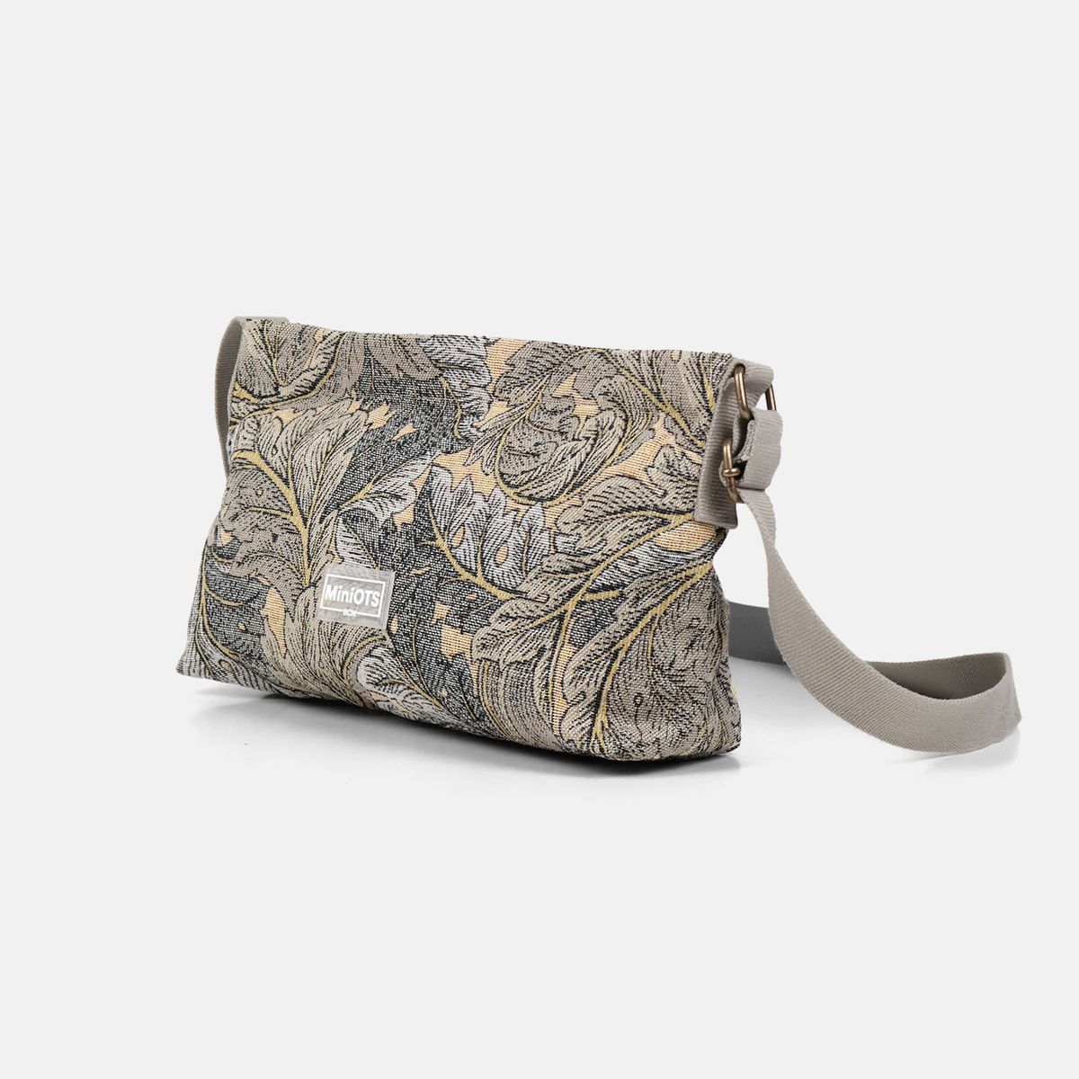 Bolsa transversal de tamanho médio com fecho de zíper. Confeccionada em tecido jacquard em tons de bordô e bege.