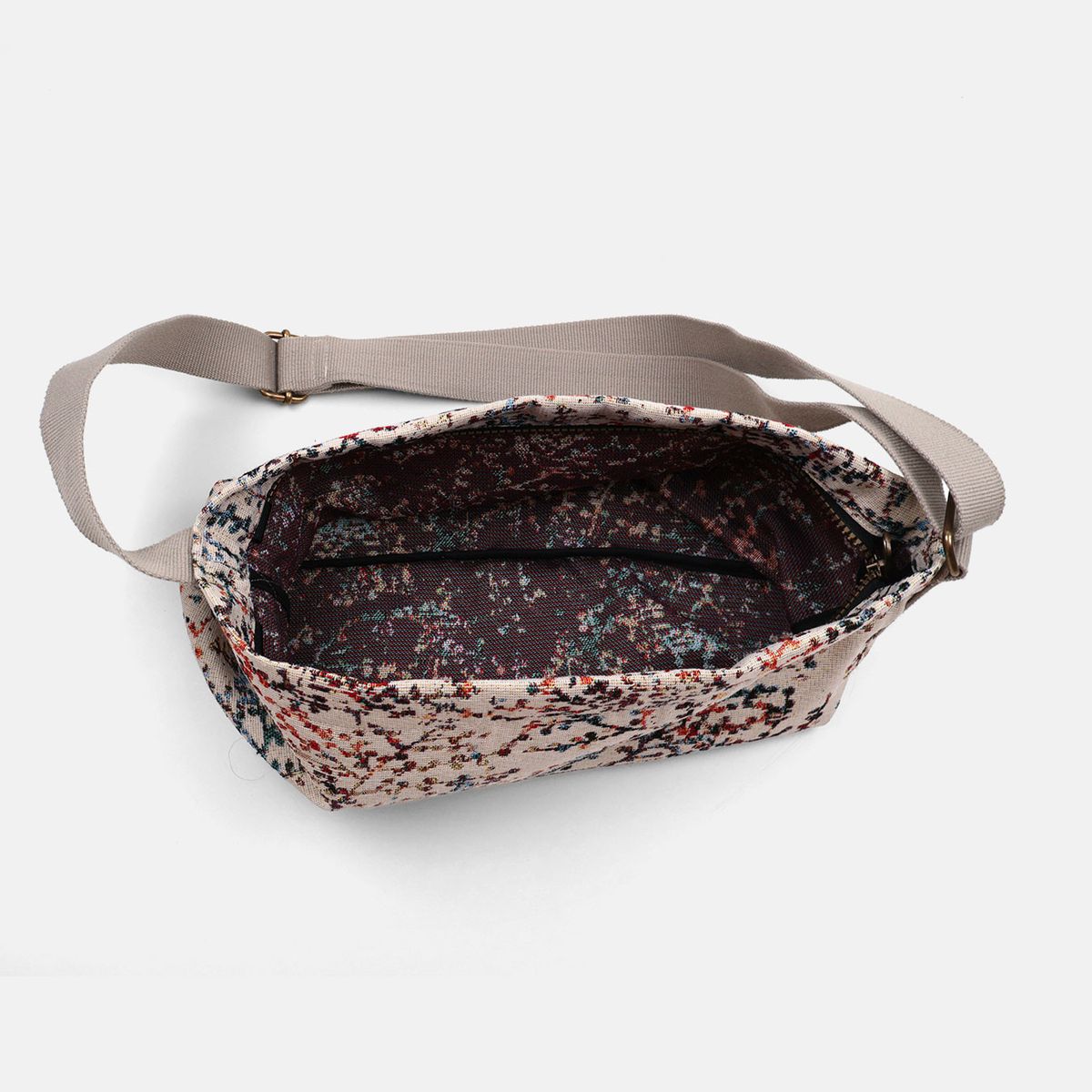 Bolsa transversal de tamanho médio com fecho de zíper. Confeccionada em tecido jacquard com fundo bege e estampa floral.