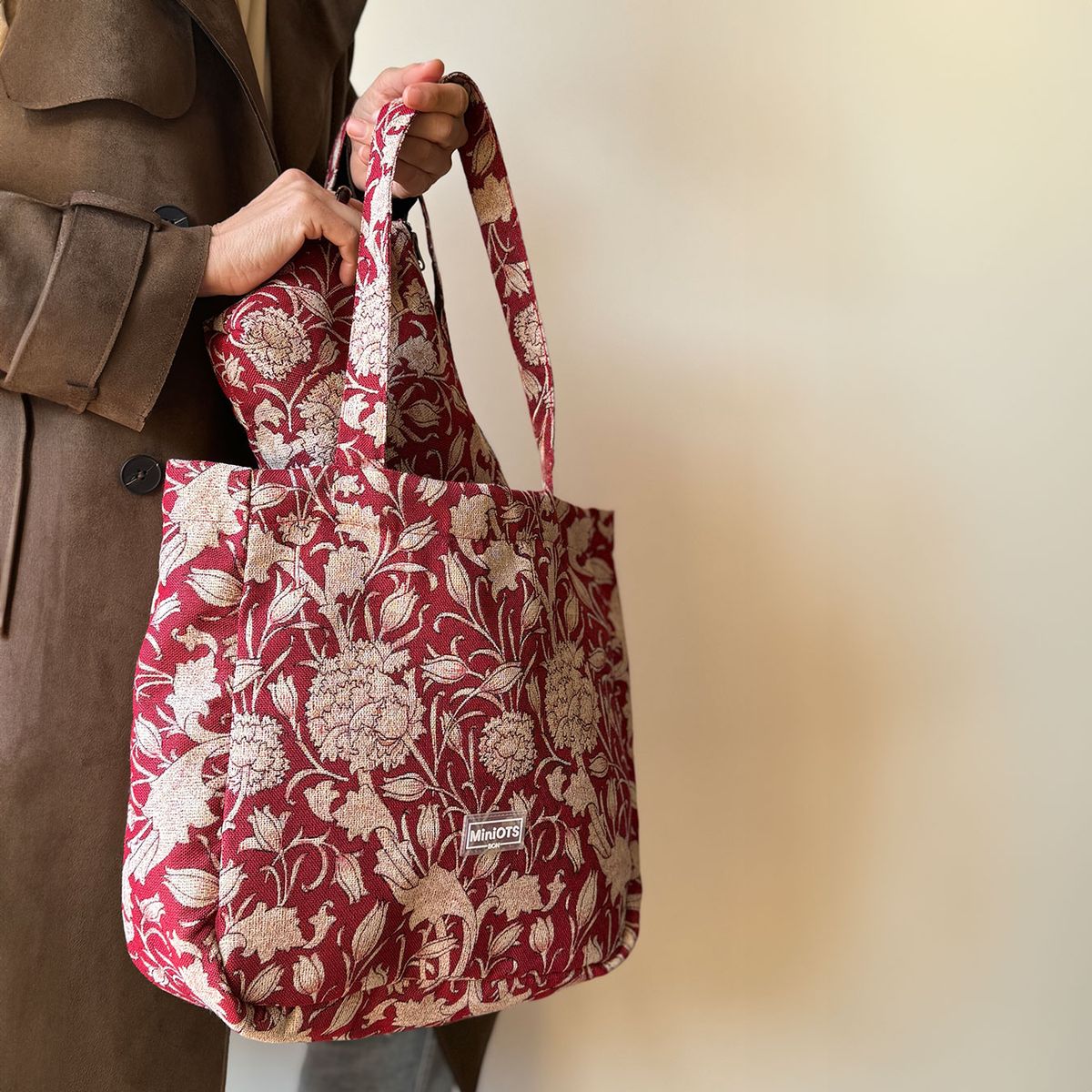 Bolsa de ombro grande com fecho de zíper. Confeccionada em tecido jacquard em tons de bordô e bege.