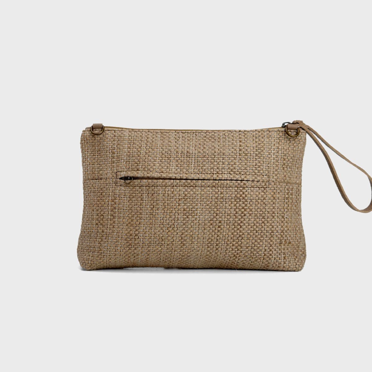 Bolsa pequena quadrada, ideal para usar na mão ou no ombro. Feita de tecido de juta.