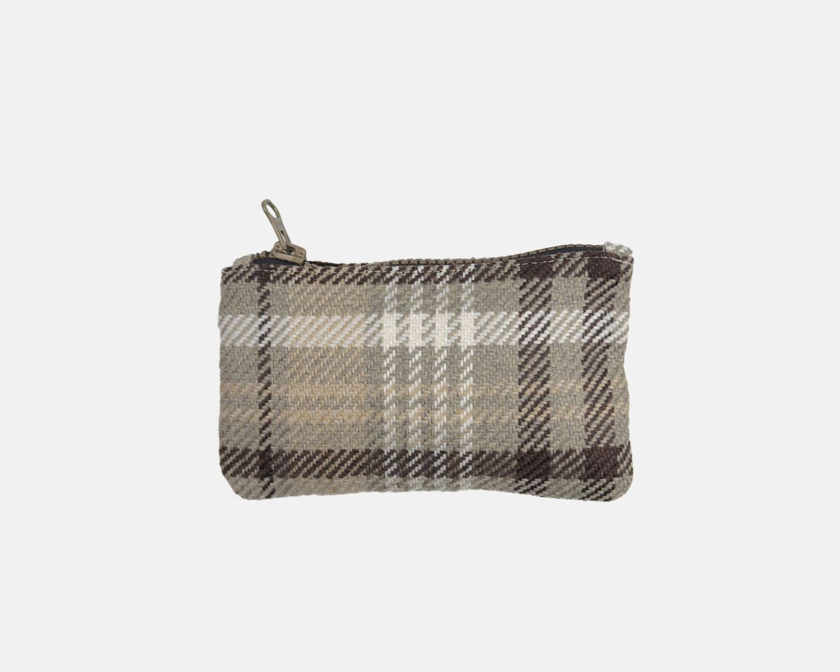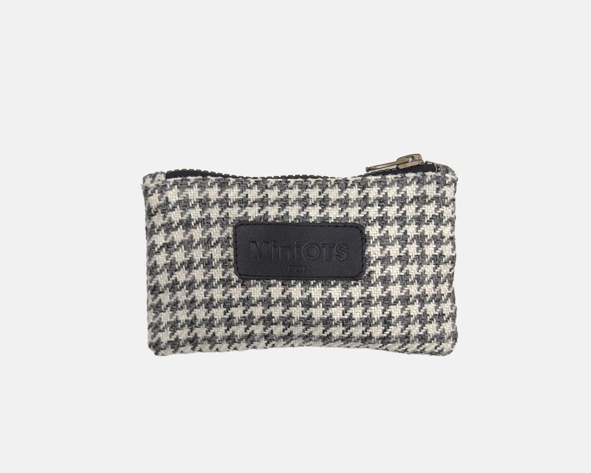 Bolsa pequena feita de tecido estampado bem leve, fechada com zíper.