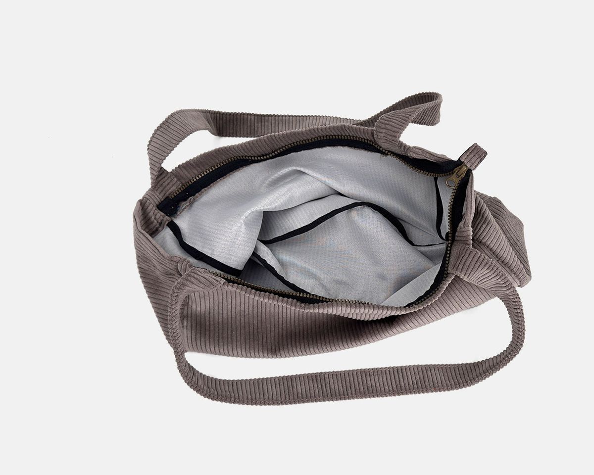 Bolsa grande tipo sacola, feita de tecido de veludo cotelê muito leve, fechada com zíper.