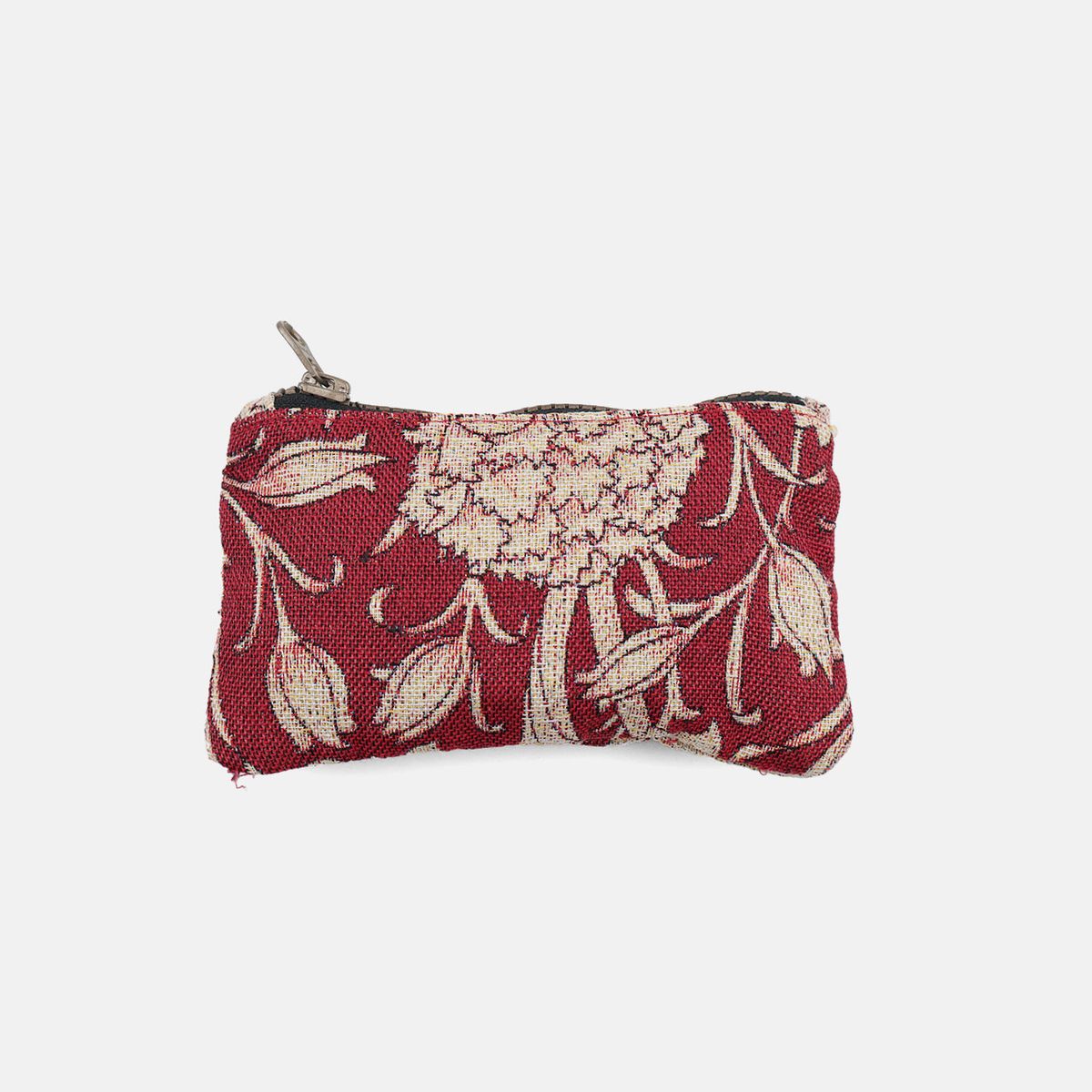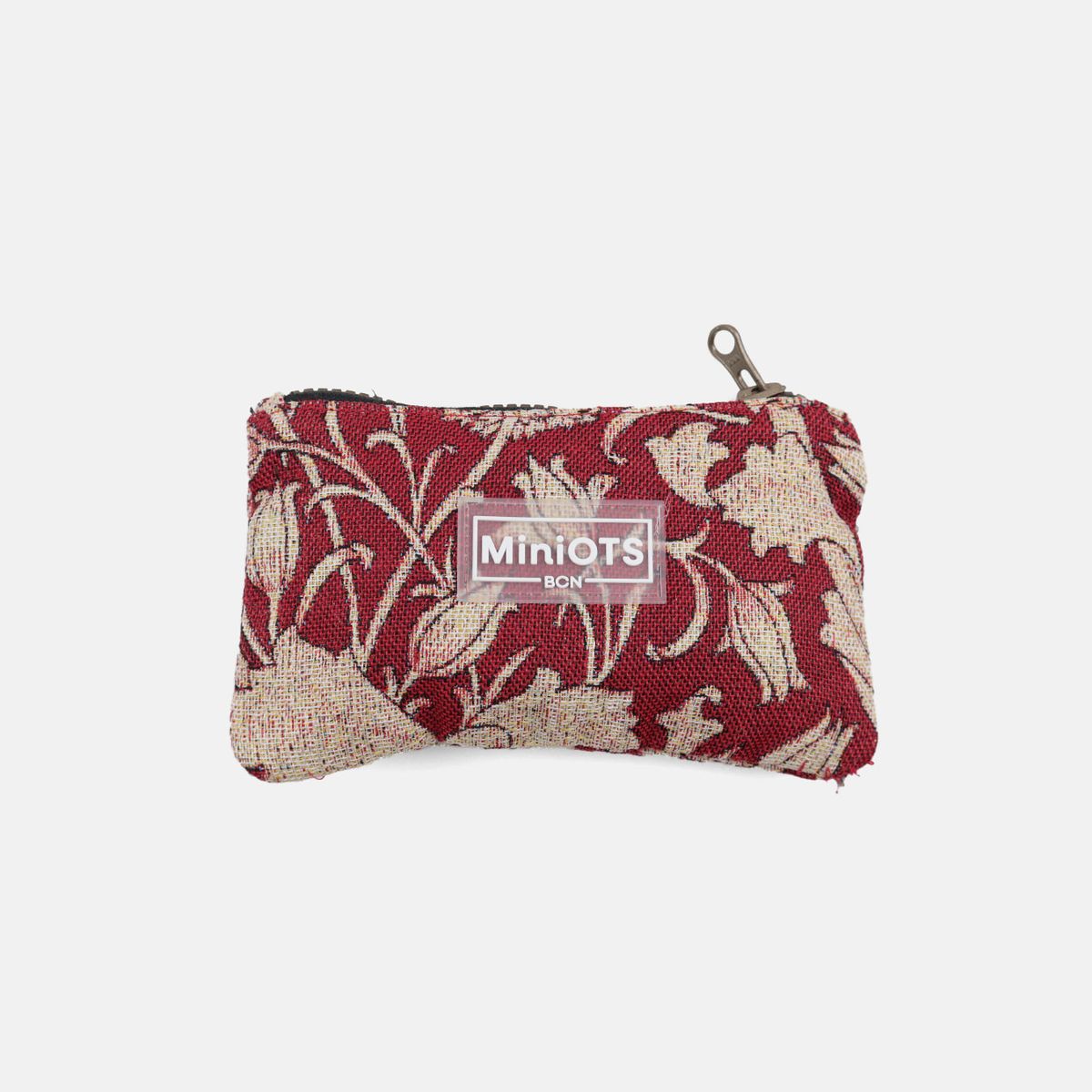Pequena carteira para moedas com fecho de zíper. Confeccionada em tecido jacquard em tons de bordô e bege.