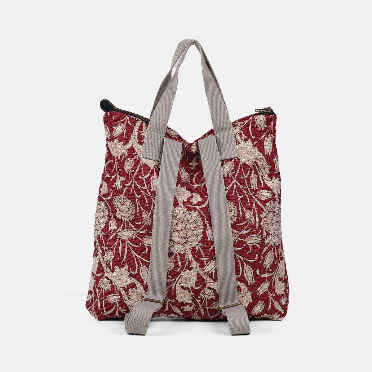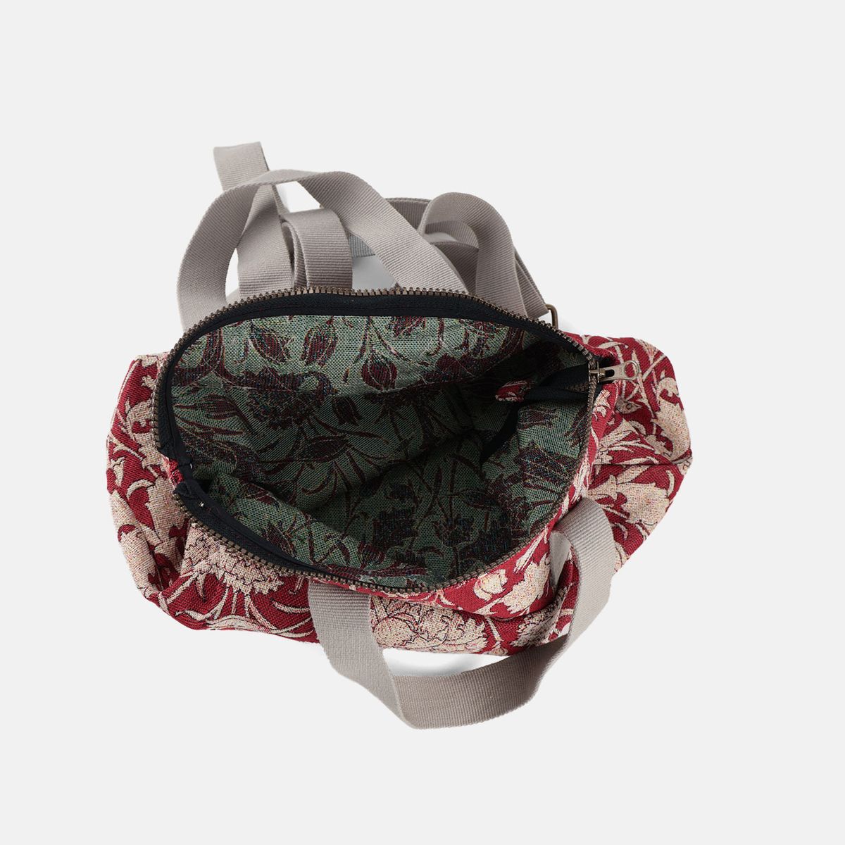 Mochila de tamanho médio com fecho de zíper. Confeccionada em tecido jacquard em tons de bordô e bege.