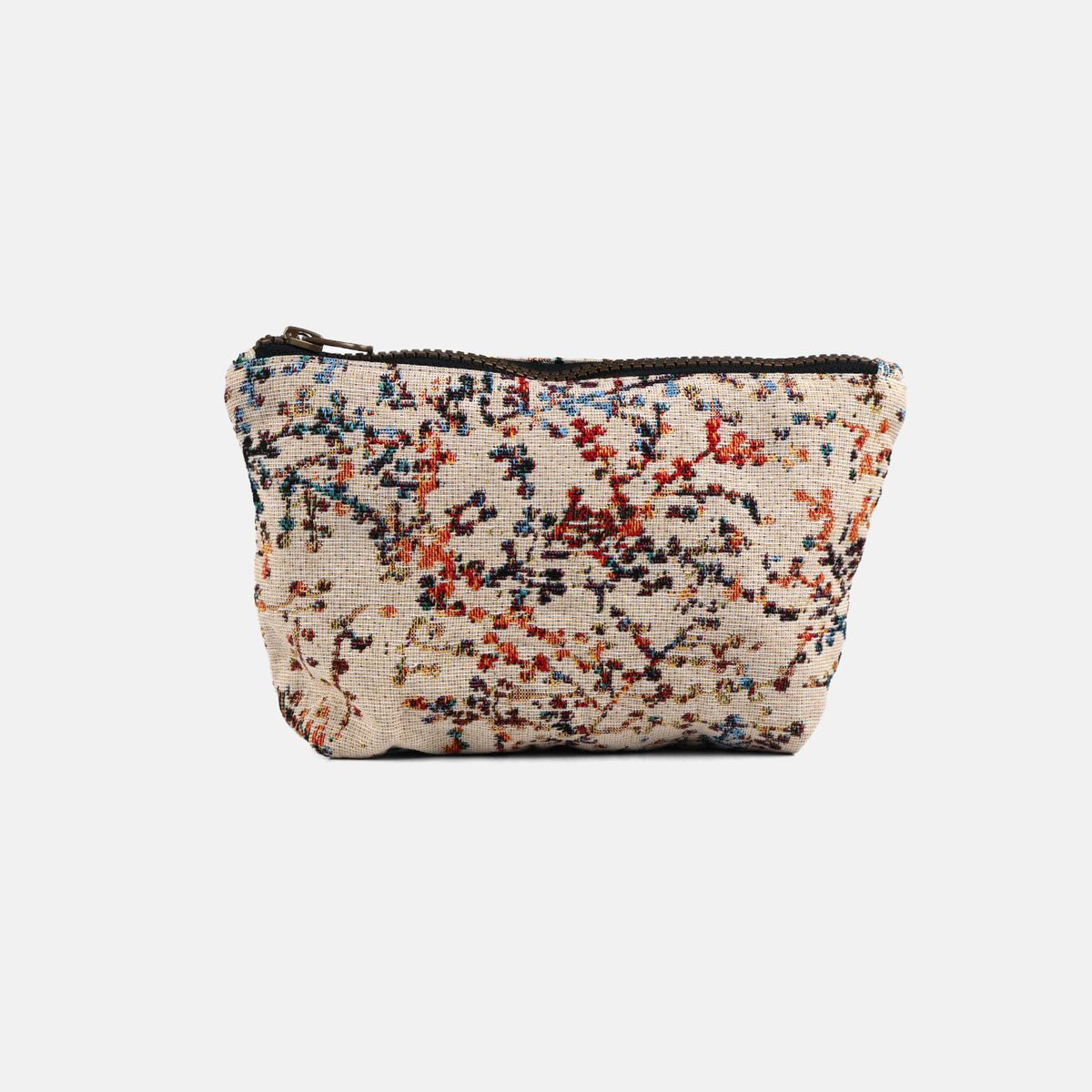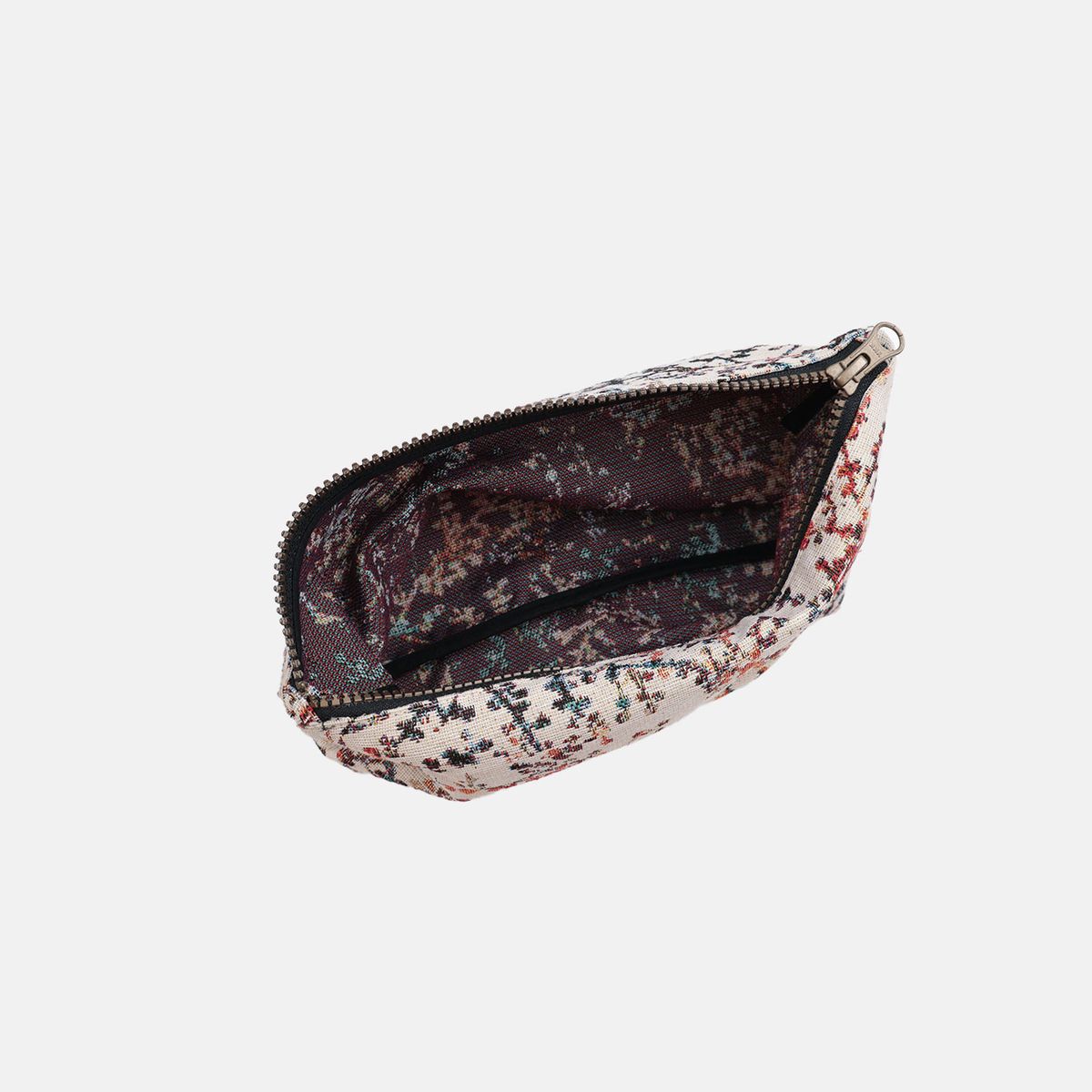 Necessaire de tamanho médio com fecho de zíper. Confeccionada em tecido jacquard com fundo bege e estampa floral.